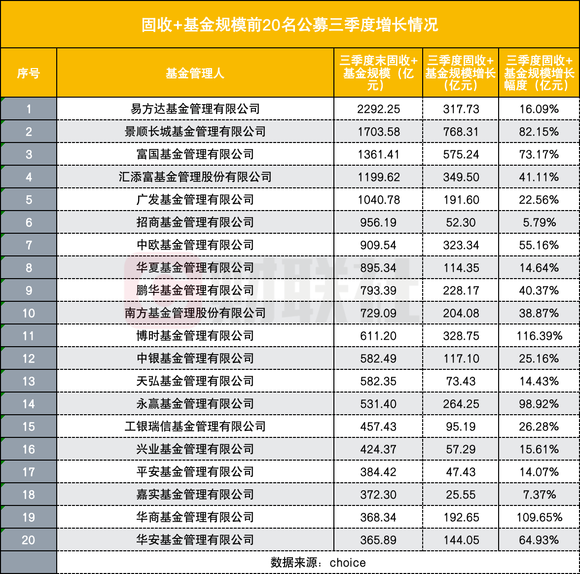 分公司来看,景顺长城基金的固收+产品规模在三季度增长768.31亿元,排名第一;富国基金的固收+产品规模在三季度增长575.24亿元,排名第二。