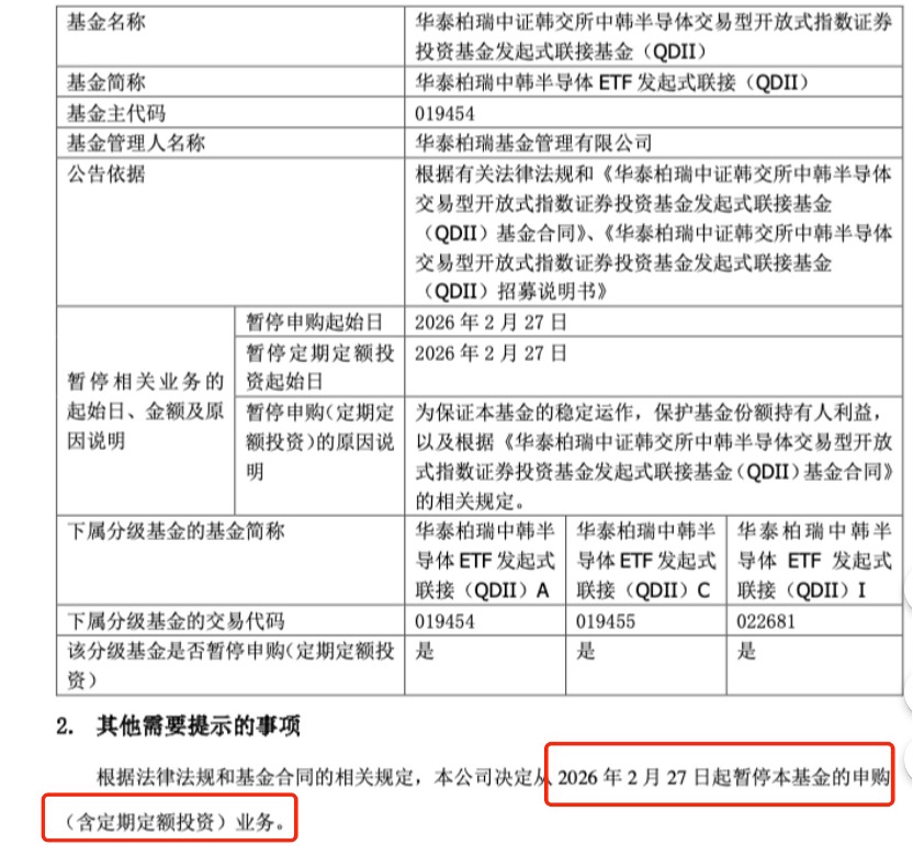 华泰柏瑞基金当前已经对旗下中韩半导体进行了全面的限购,自2月27日起,该ETF联接基金A、C、I份额均暂停申购。