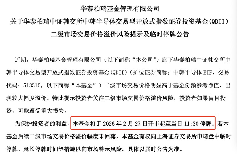 2月27日,华泰柏瑞中韩半导体ETF在场内停牌半天,这一举动立马引起了市场的关注,以往场内基金高溢价需要向市场警示风险,多是停牌一小时,停牌半天的并不多见,停牌时间延长一定程度上也是产品风险提示升级的重要信号。