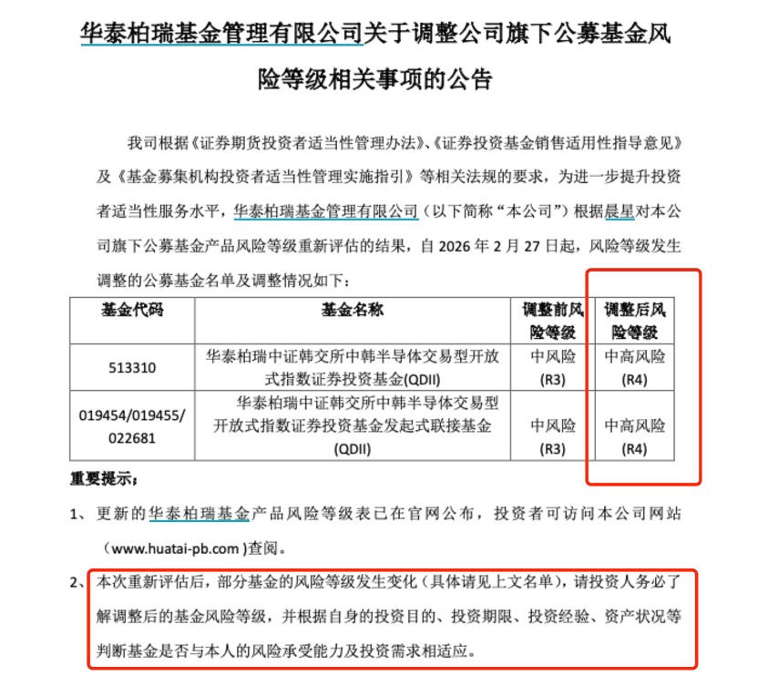 此外,在提示风险的举措上,华泰柏瑞基金同时公告称,根据晨星对公司产品等级重新评估的结果,自2月27日起,将中韩半导体ETF风险等级从R3提升至R4,投资人务必了解调整后的基金风险等级,并根据自身的投资目的、投资期限、投资经验、资产状况等判断基金是否与本人的风险承受能力及投资需求相适应。