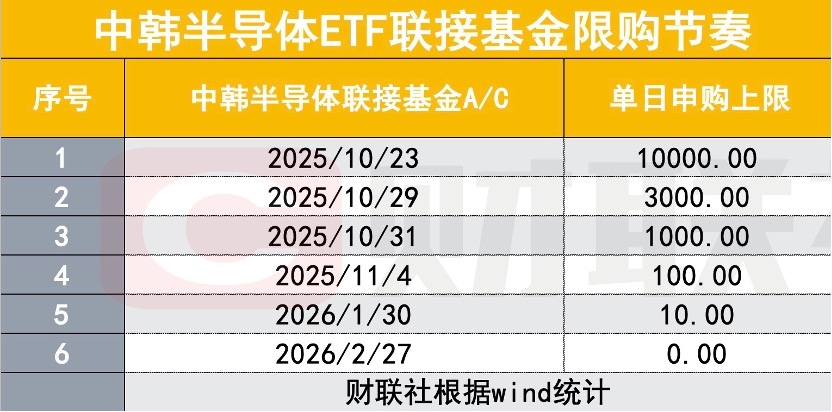 不完全统计显示,自2025年10月起至今,华泰柏瑞中韩半导体ETF联接基金已经连续6次升级了限购,从1万元、3000元、1000元、100元、10元直至完全限购。