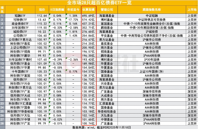 截至11月18日,全市场53只债券ETF最新规模达到了7121.6亿元,百亿规模以上的债券ETF达到28只,其中,海富通短融ETF以695.69亿元居首,博时可转债ETF规模排名第二,为574.42亿元,富国政金债ETF为437.21亿元,排名第三。此外,鹏扬30年国债ETF今年以来规模增长同样迅速,最新规模达到352.71亿元。