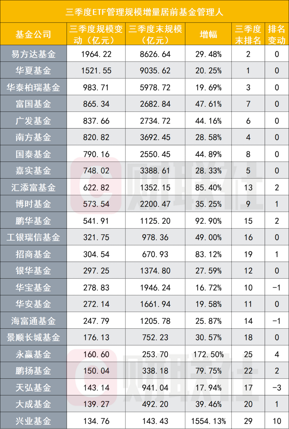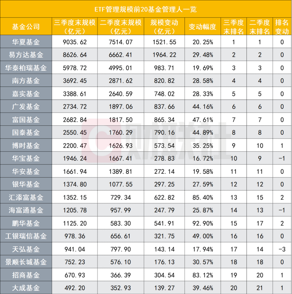 所有ETF管理人中,易方达基金、华夏基金、华泰柏瑞基金是三季度规模增量最多的3家;此外,其余5家三季度规模增长超700亿的管理人也是前十机构,分别是富国基金、广发基金、南方基金、国泰基金、嘉实基金。
