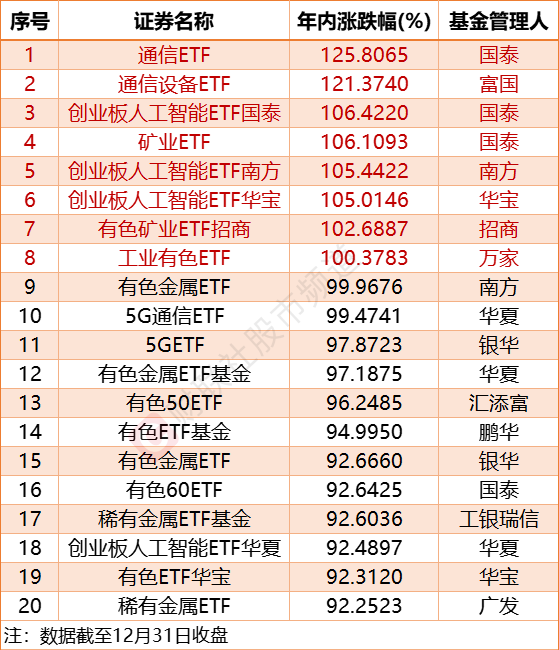 【2025年8只ETF实现翻倍 超200只ETF年内涨超50%】财联社12月31日电,2025年ETF涨幅榜单出炉,8只ETF涨幅翻倍,超200只ETF涨幅超50%。在涨幅排名前十的ETF中,AI以及通信设备相关ETF占据其中六席,通信ETF(515880.SH)与通信设备ETF(159583.SZ)年内双双大涨超120%,三只跟踪创业板人工智能指数的ETF产品涨幅均超100%。与此同时,抗通胀属性突出的资源类ETF表现同样亮眼,矿业ETF(561330.SH)、有色矿业ETF招商(159690