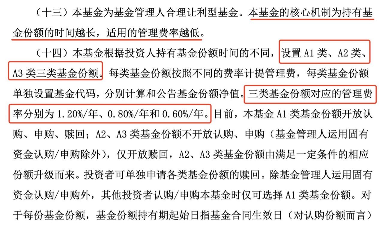 具体来看,持有人持有基金份额时间不同,设置A1类、A2类、A3类三类基金份额。每类基金份额按照不同的费率计提管理费,每类基金份额单独设置基金代码,分别计算和公告基金份额净值。