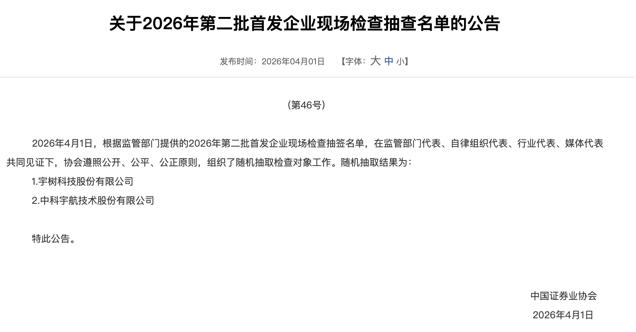 《科创板日报》4月1日讯(记者 黄修眉)中国证券业协会官网今日(4月1日)发布2026年第二批首发企业现场检查抽签名单。