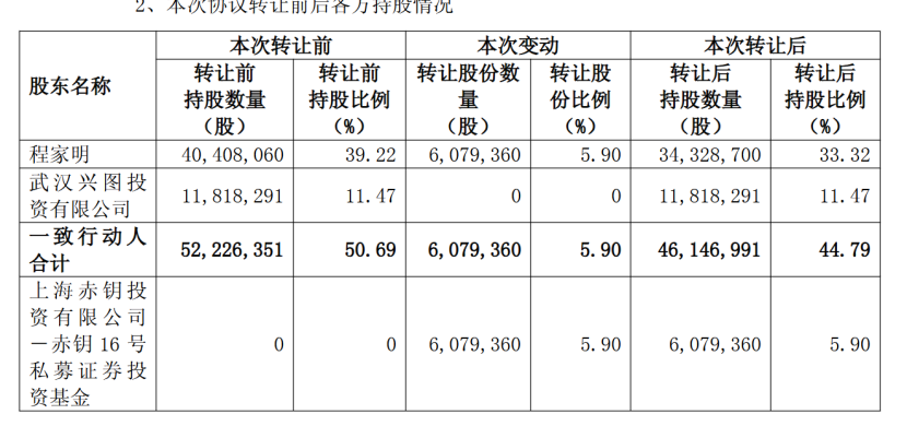 截至目前,程家明为兴图新科的控股股东、实际控制人、董事长、总经理;程家明持有兴图投资72.7775%的股权,程家明和兴图投资之间存在一致行动关系。本次权益变动后,程家明及其一致行动人合计持股降至44.79%。