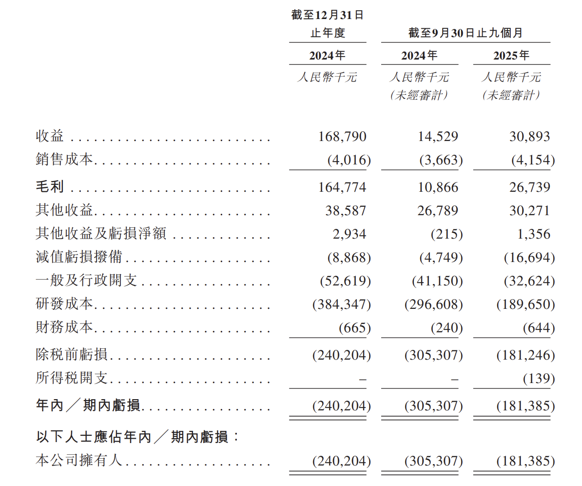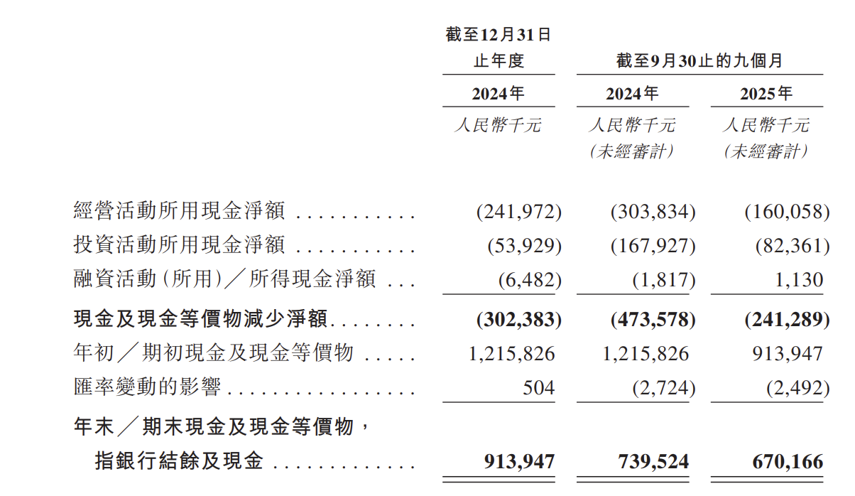 但另一方面,益方生物的账面资金正处于快速消耗中,其现金及银行结余已由2024年末的9.14亿元下降到了2025年9月末的6.70亿元。
