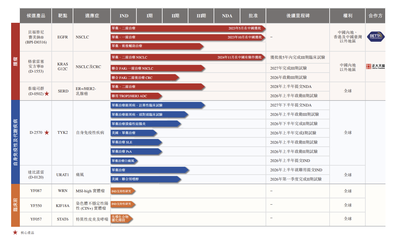 益方生物在现阶段还有另外两款被寄予厚望的核心产品D-0502和D-2570,前者是一款口服选择性雌激素受体降解剂(SERD),开发适应症主要为乳腺癌,后者则是一款靶向TYK2的新型口服选择性抑制剂,主要用于银屑病等自身免疫性疾病的治疗,该两款产品均进入注册性III期临床试验阶段。