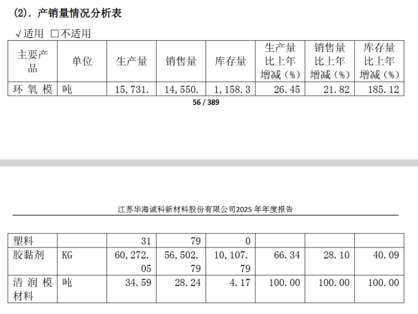 华海诚科表示,环氧模塑料库存量增加主要系新增子公司纳入合并范围影响;胶黏剂生产量增加主要系销售订单增加所致;清润模材料为本年新增产品。