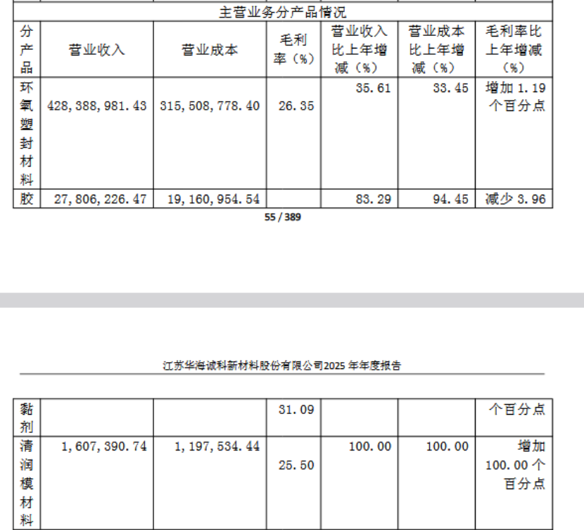 对于毛利率同比提升,华海诚科表示,环氧塑封料在QFN、BGA等中高端产品销量大幅增长,胶黏剂在先进封装领域持续突破,产品结构向先进封装加速转型。