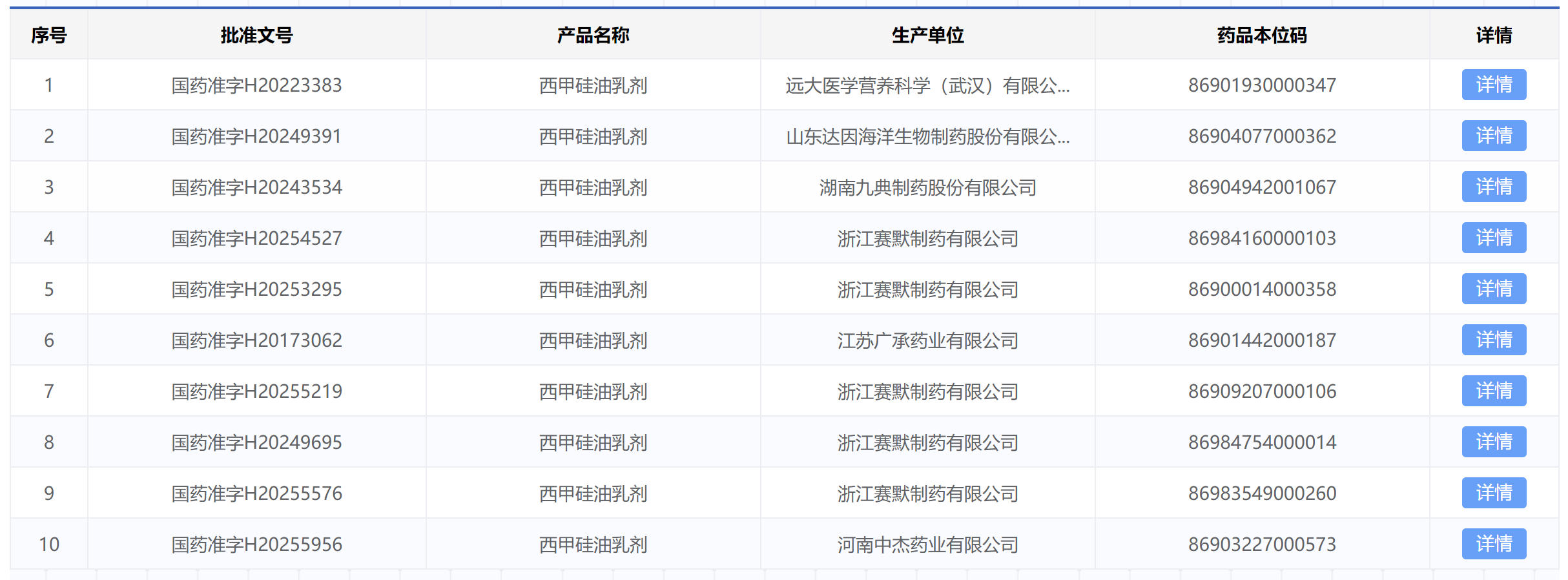另据国家药监局官网信息,西甲硅油乳剂的原研产品早已进入国内市场,原研厂商为Berlin-Chemie AG。与此同时,国内还有多款西甲硅油乳剂仿制药产品获批,涉及企业包括远大医学、九典制药、扬子江药业、赛默制药、中杰药业、万高药业等。