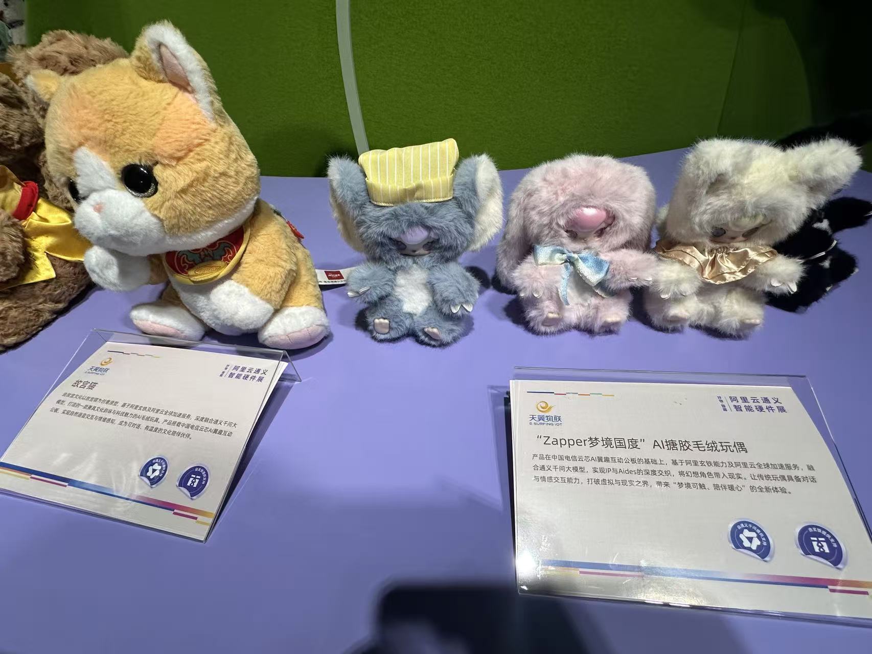 中国电信旗下天翼物联也来参展。“Zapper梦境国度”AI搪胶毛绒玩偶在中国电信云芯AI翼趣互动公板的基础上,基于阿里玄铁能力及阿里云全球加速服务,融合通义千问大模型。