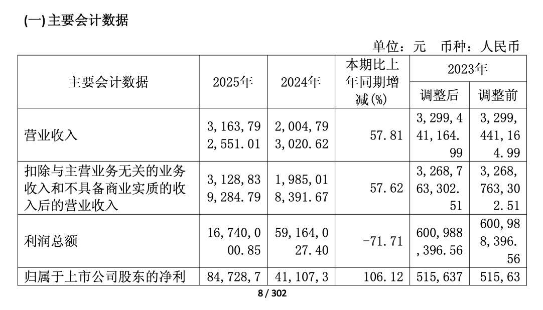 其年报显示,该公司2025年实现营业收入31.64亿元,同比增长57.81%;归母净利润8473万元,同比增长106.12%;扣非净利润-998.7万元,上年同期为-2813万元。