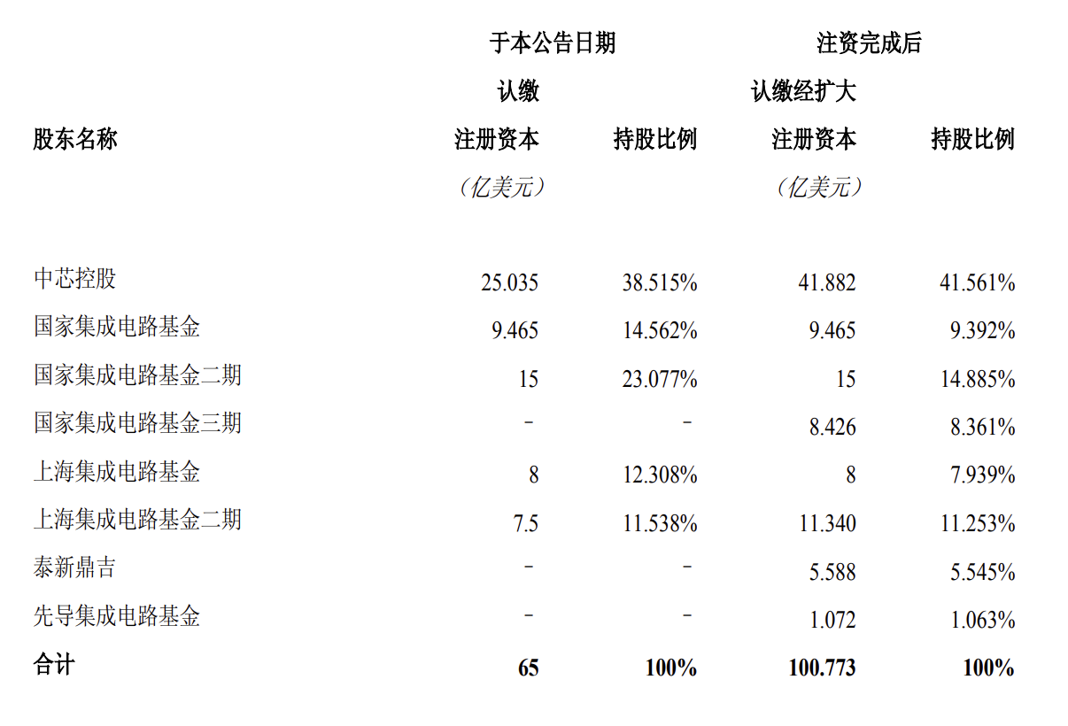 由此,中芯控股、国家集成电路基金、国家集成电路基金二期、国家集成电路基金三期、上海集成电路基金、上海集成电路基金二期、泰新鼎吉、先导集成电路基金,将分别持有中芯南方41.561%、9.392%、14.885%、8.361%、7.939%、11.253%、5.545%及1.063%股权。