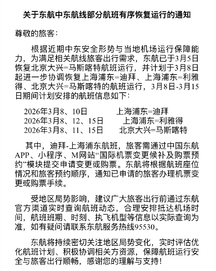 财联社3月6日电,东方航空宣布,东航中东航线部分航班有序恢复运行。