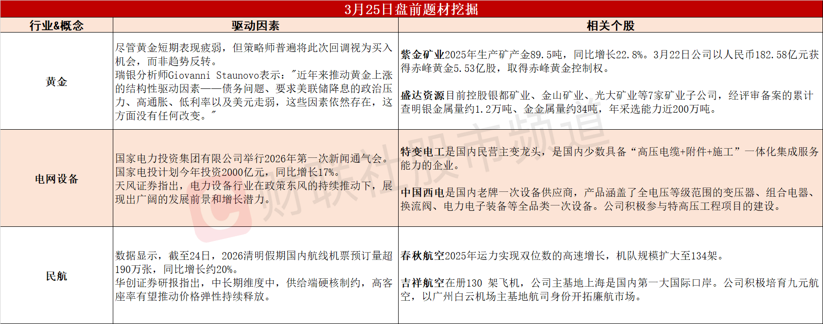 【盘前题材挖掘】①基本面未发生转变,机构重申黄金看涨预期。②国家电投计划今年投资2000亿元,电力设备行业增长潜力凸显。③清明假期国内机票预订量攀升,高客座率有望推动价格弹性释放。