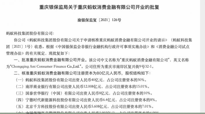 2021年6月3日,重庆银保监局网站发布消息称,重庆蚂蚁消费金融有限公司在法定筹建期内,符合条件获批开业 。