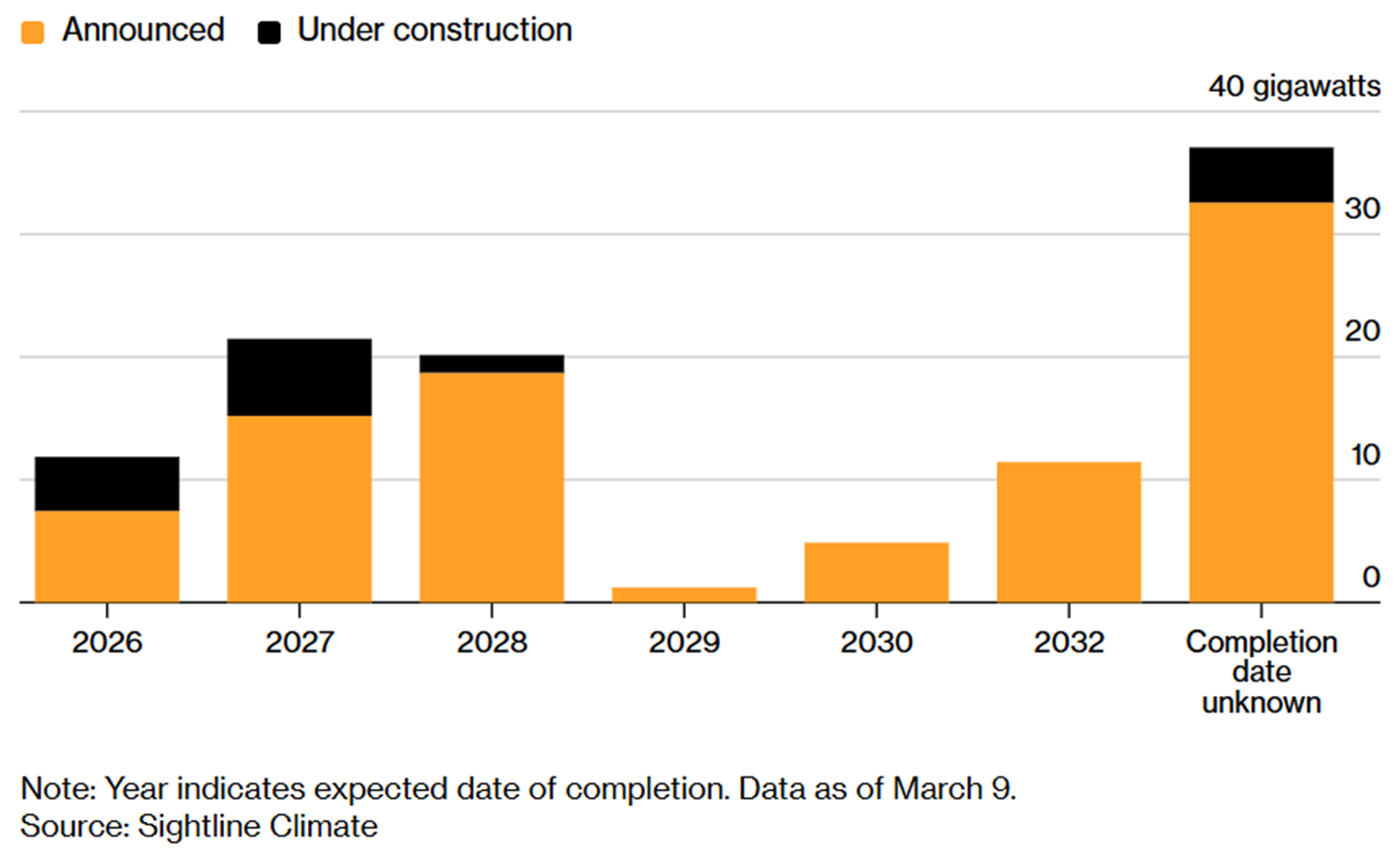 市场情报公司Sightline Climate数据显示,在2026年,美国有大约12吉瓦数据中心项目计划投入运行,但目前仅有约三分之一处于在建状态。