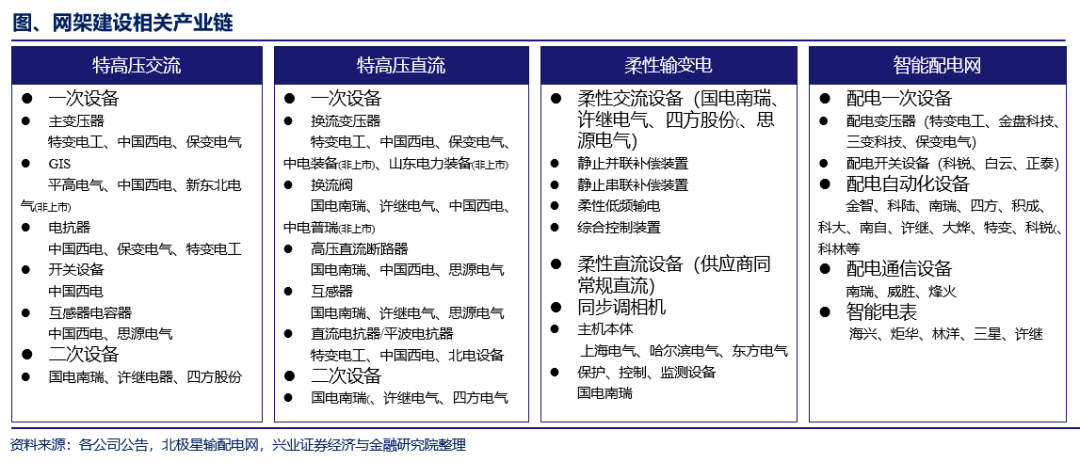 网架建设相关产业链:主要包括特高压、配电网相关一次设备、二次设备制造商,以及工程规划、设计、实施、系统集成企业。