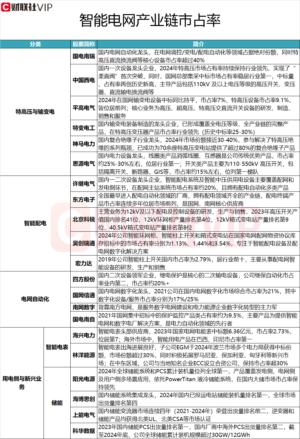 据VIP盘中宝•数据栏目此前梳理,智能电网产业链中,智能配电和电网自动化领域涉及的上市公司包括许继电气、东方电子、北京科锐、昊创瑞通、宏力达、四方股份、国网信通、南网数字和国电南自,具体情况详见下图:
