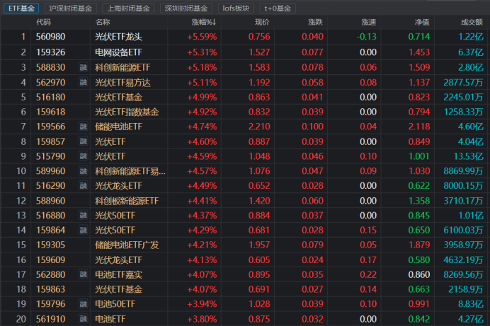 受电力设备股活跃提振,与其相关的ETF基金今日也成为资金扫货重点。截至今日收盘,涨幅居前的20只ETF均所属电力设备系。其中,光伏ETF龙头(560980)以5.59%的涨幅位居涨幅榜首位,涨幅位居第二的电网设备ETF(159326)盘中则一度触及涨停。此外,科创新能源(588830)、光伏ETF易方达(562970)等电力设备相关ETF今日也涨幅居前。
