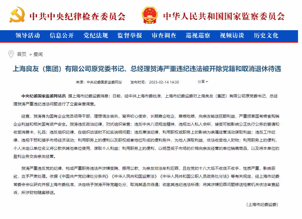 上海良友(集团)有限公司原党委书记、总经理贺涛严重违纪违法被开除党籍和取消退休待遇