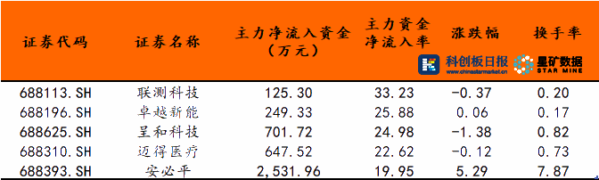 【数据|科创板主力资金净流出310股 先惠技术流出率最高】《科创板日报》14日讯,科创板日报•星矿数据统计显示,今日主力资金净流入的科创板个股共有232只,联测科技净流入125.3万元,主力资金净流入率居首;卓越新能、呈和科技紧随其后。主力资金净流出的科创板个股共310只,先惠技术流出率最高,共流出2109.44万元,其次是大地熊、*ST富吉。