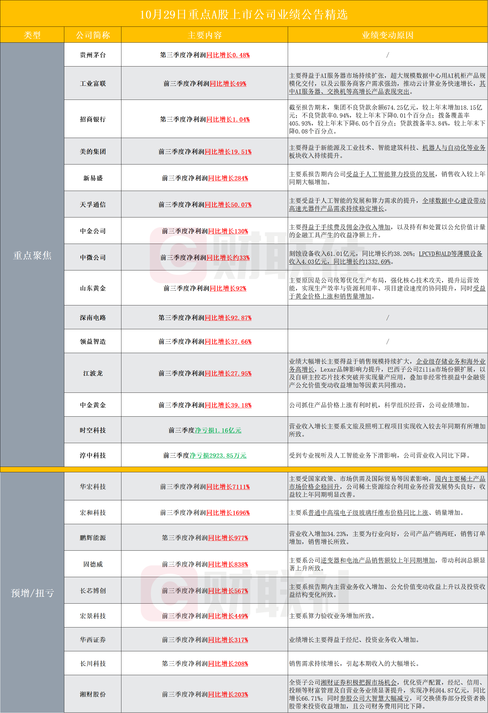 【盘后A股上市公司重点业绩公告精选】财联社10月29日电,据财联社不完全统计,截至发稿,盘后包括贵州茅台、工业富联、招商银行、美的集团、新易盛、天孚通信、中金公司、中微公司、山东黄金、深南电路、领益智造、江波龙、中金黄金、时空科技、淳中科技、华宏科技、宏和科技、鹏辉能源、固德威、长芯博创、宏景科技、华西证券、长川科技和湘财股份等多家A股上市公司发布2025年三季报。其中,贵州茅台第三季度净利润同比增长0.48%,工业富联前三季度净利润同比增长49%。