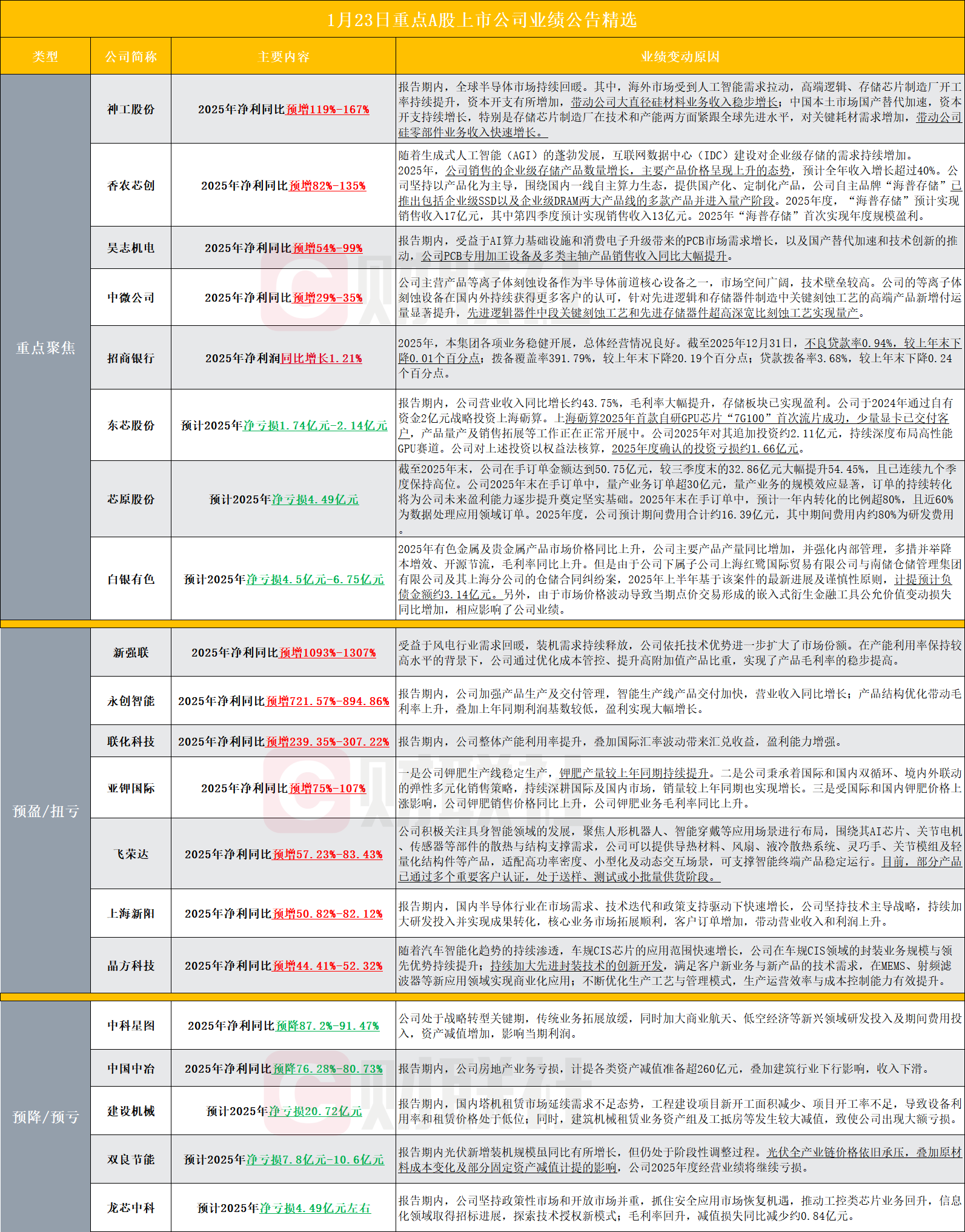 【盘后A股上市公司重点业绩公告精选】财联社1月23日电,据财联社不完全统计,截至发稿,盘后包括神工股份、香农芯创、昊志机电、中微公司、招商银行、东芯股份、芯原股份、白银有色、新强联、永创智能、联化科技、亚钾国际、飞荣达、上海新阳、晶方科技、中科星图、中国中冶、建设机械、双良节能、龙芯中科等多家A股上市公司发布2025年业绩预告或业绩快报。其中,香农芯创公告,2025年净利同比预增82%-135%,企业级存储产品销售数量增长。4连板白银有色公告,预计2025年净亏损4.5亿元-6.75亿元。