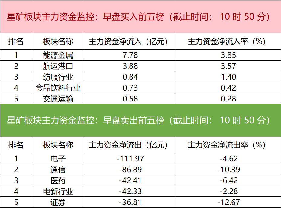 【主力资金监控:新易盛净卖出超28亿】财联社10月30日电,财联社星矿数据显示,今日早盘主力资金净流入能源金属、航运港口、纺服行业等板块,净流出电子、通信、医药等板块,其中电子板块净流出超111亿元。个股方面,华友钴业上涨,主力资金净买入超5亿元位居首位,中微公司、天际股份、蓝色光标获主力资金净流入居前;新易盛遭净卖出超28亿元,天孚通信、药明康德、胜宏科技资金净流出额居前。