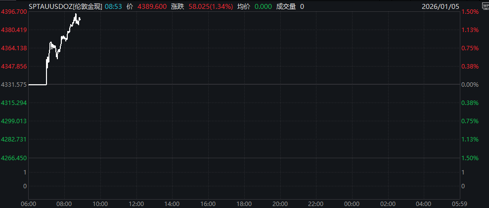 1月5日讯(编辑 潇湘)在美国周末对委内瑞拉发起“斩首式”军事行动、强行抓捕委内瑞拉总统马杜罗后,全球投资者在新年伊始正面临地缘政治风险的再度大幅升温。周一开盘后,国际油价在小幅低开后走高、现货黄金和白银价格则大幅上涨。
