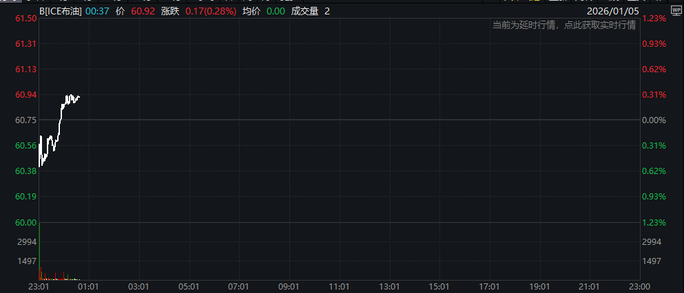 行情数据显示,在周末马杜罗被捕后,布伦特原油周一开盘一度曾短暂下跌1.2%至每桶60美元,不过此后价格又再度反弹。截至发稿,美、布两油抹去盘初逾1%的跌幅转涨,现分别报57.42美元/桶和60.90美元/桶。
