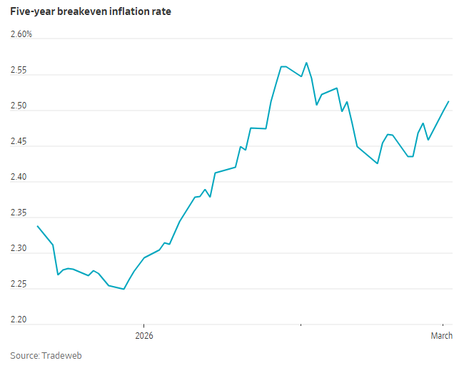 事实上,中东冲突本周已推高了部分市场通胀预期指标。五年期名义美债收益率与五年期通胀保值国债(TIPS)收益率之间的差距——即所谓的“盈亏平衡通胀率”,已从上周五的2.46%攀升至2.5%以上。