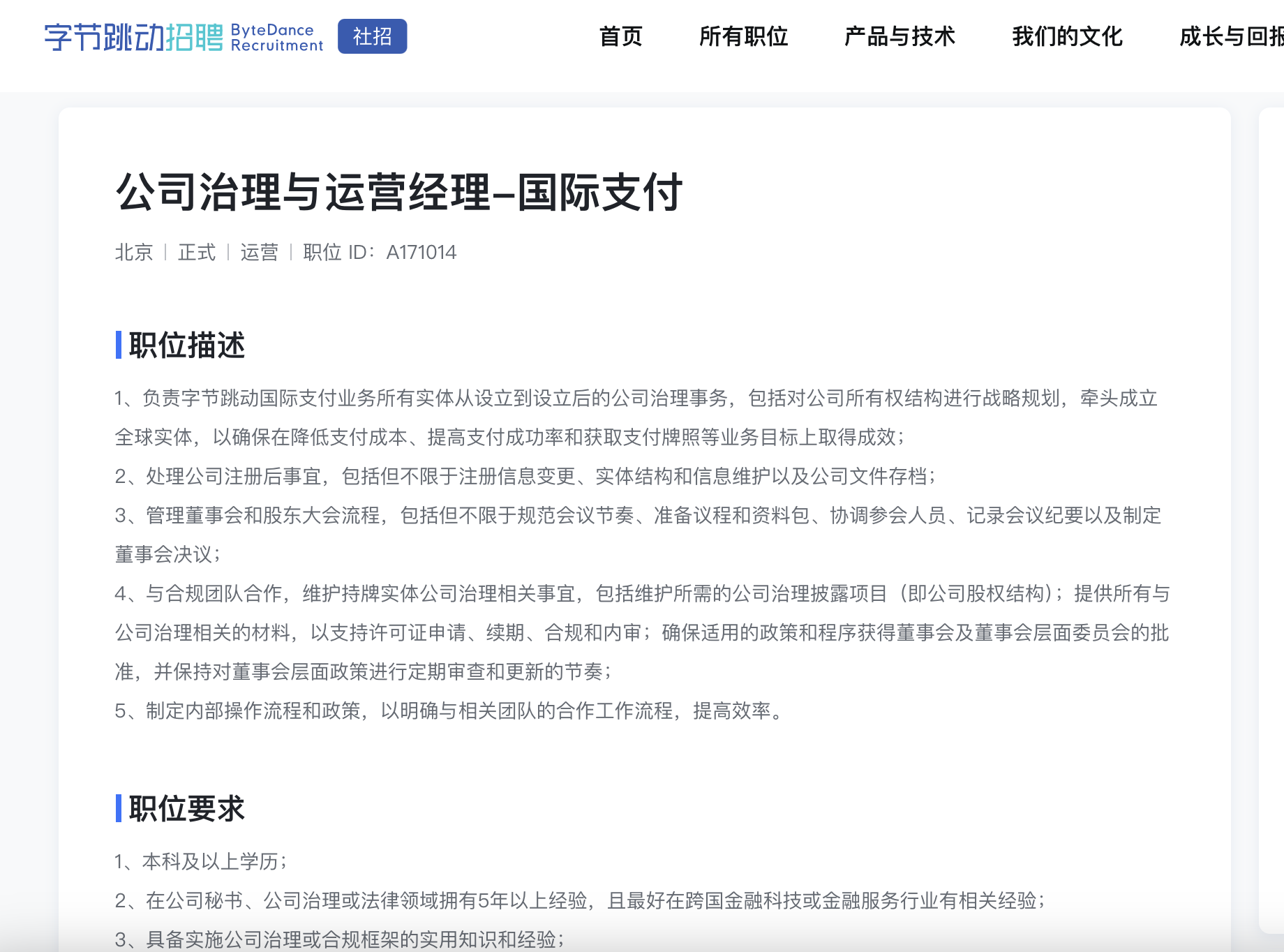 加码国际业务?字节跳动招聘国际支付治理岗位引关注