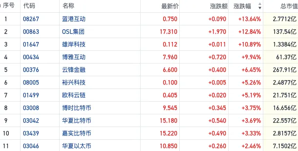 截至发稿,今日港股加密货币概念股集体拉涨,蓝港互动(08267.HK)涨超13%,OSL集团(00863.HK)涨逾12%,博雅互动(00434.HK)、云锋金融(00376.HK)等个股也均大幅跟涨5%以上。此外,多只在港上市的数字货币ETF也明显走强。