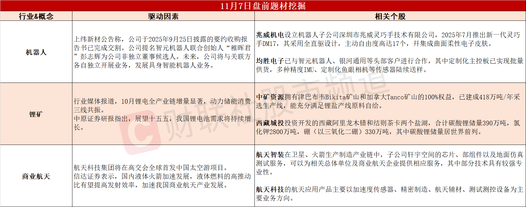 【盘前题材挖掘】①上纬新材要约收购高效落地,人形机器人产业加速崛起。②动力储能消费三线共振,锂矿企业有望走出低谷。③中国太空游项目将在高交会全球首发,商业航天板块有望站上风口。