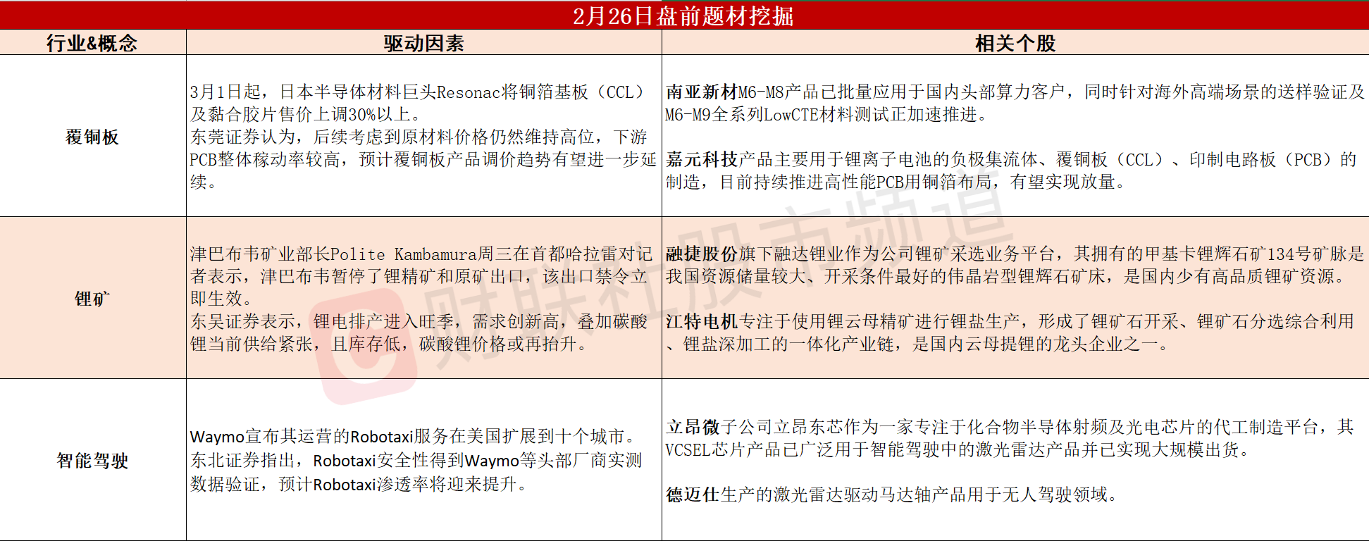 【盘前题材挖掘】①覆铜板巨头即将提价,CCL产品调价趋势有望延续。②锂矿供应收紧,碳酸锂价格或再抬升。③Robotaxi扩张运营范围,智驾行业催化不断。