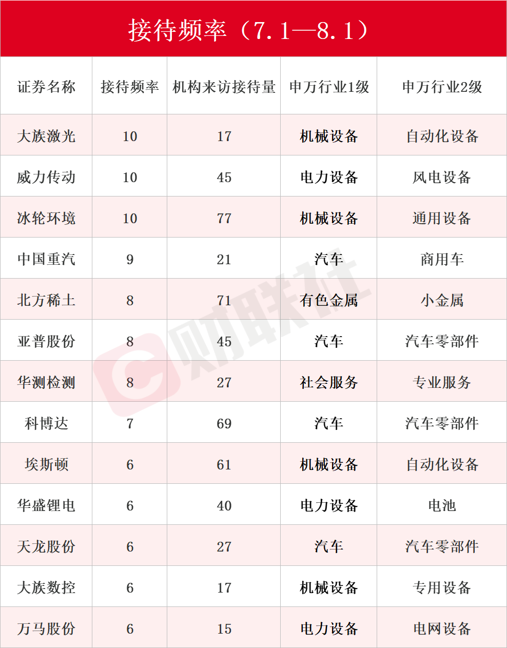 8月2日讯(编辑 笠晨)据Choice数据统计,截至发稿,近一月沪深京三市(7.1-8.1)共有771家上市公司接受机构调研。具体来看,接待机构调研次数最多的上市公司是大族激光、威力传动和冰轮环境,均达10次;中国重汽位列第四,接待次数为9次;北方稀土、亚普股份和华测检测紧随其后,接待次数为8次。具体详见下图: