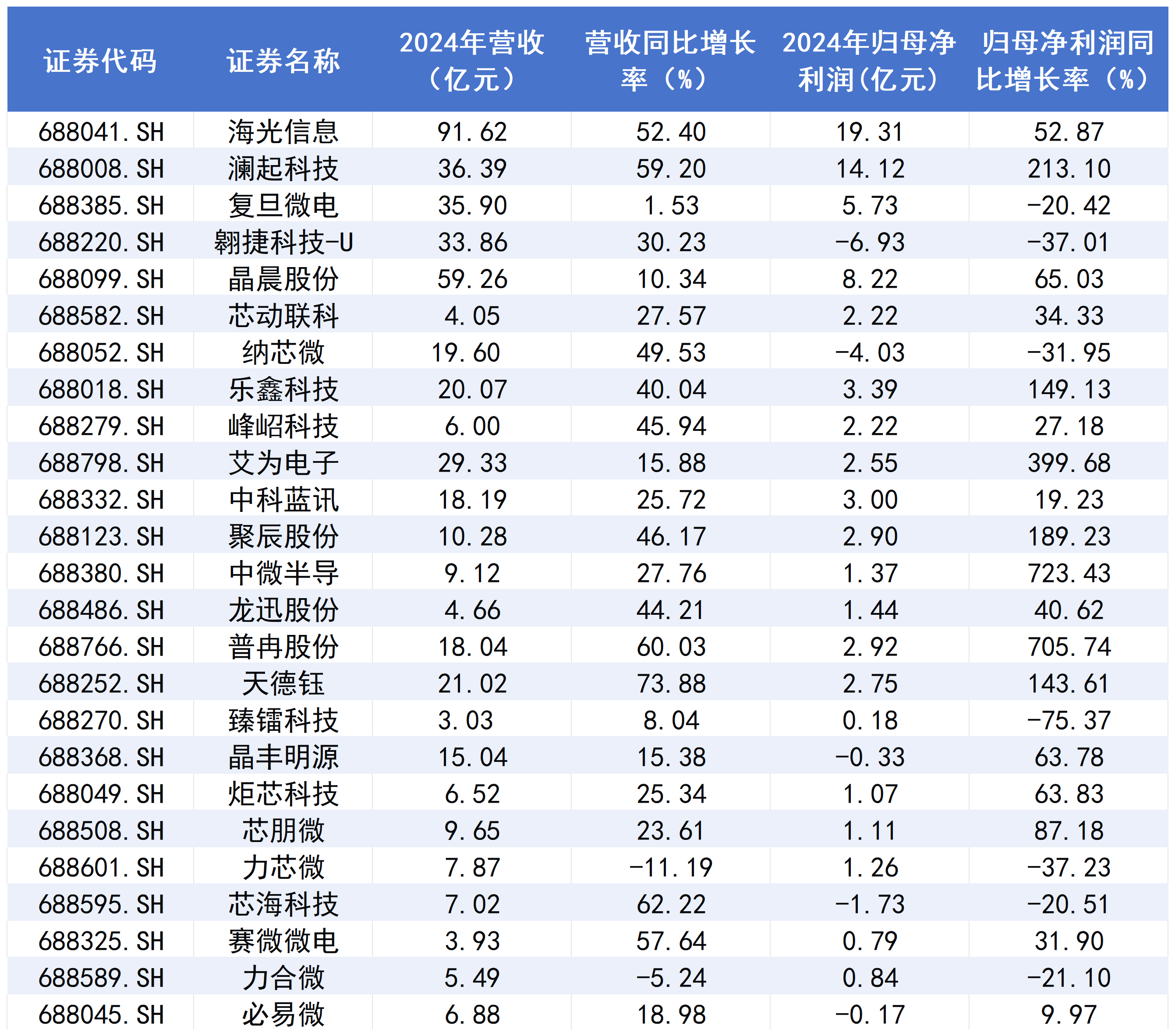据统计,上述公司中有18家2024年营业收入及归母净利润均实现正增长。其中,普冉股份、中微半导表现突出,去年净利润皆同比增超7倍,前者主营NOR Flash等存储芯片产品,后者以MCU产品为核心。此外,乐鑫科技、聚辰股份、天德钰等亦实现同比倍增。