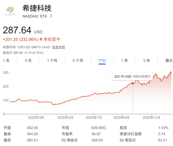 希捷科技是全球领先的机械硬盘(HDD)和数据存储解决方案提供商,产品广泛应用于数据中心、云计算、个人电脑及消费电子设备。今年以来,该股上涨了逾230%。