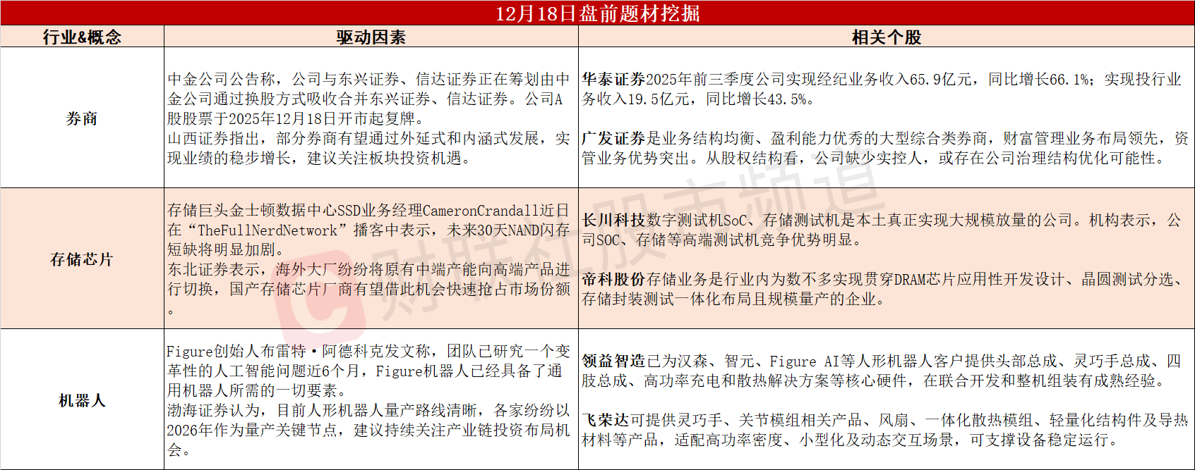 【盘前题材挖掘】①中金公司今日复牌!券商并购浪潮再起,板块有望迎来估值修复。②未来30天NAND闪存短缺将明显加剧,国产存储芯片厂商有望迎来爆发。③人形机器人量产路线清晰,机构建议关注产业链投资布局机会。
