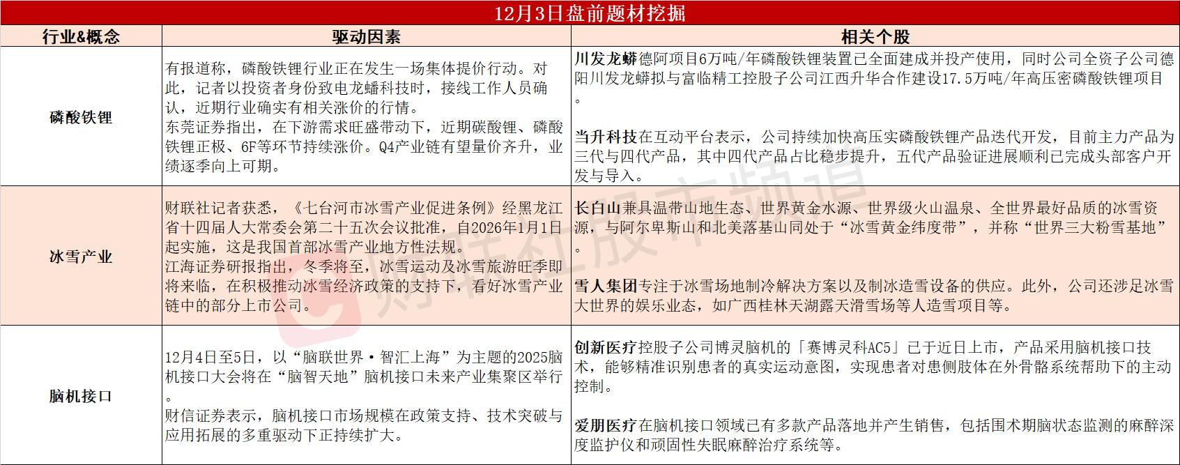 【盘前题材挖掘】①磷酸铁锂行业正集体提价,机构称四季度产业链有望量价齐升。②首部地方性冰雪产业法规出台,当前冰雪旅游热度快速上升。③2025脑机接口大会将在上海举办,脑机接口产业链创新发展加速。