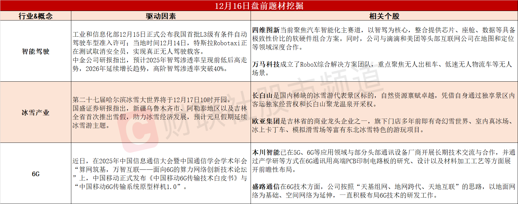 【盘前题材挖掘】①我国公布首批L3级自动驾驶车型准入许可,高阶智驾渗透率或持续提升。②哈尔滨冰雪大世界将于明日开园,冰雪经济有望成为扩内需重要抓手。③中国移动发布6G传输系统原型样机,通信板块迎产业升级机遇。