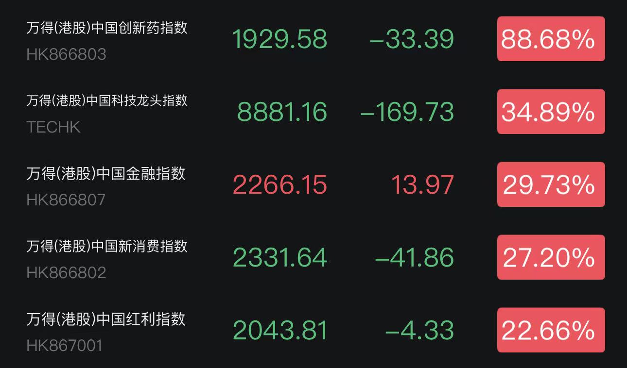 据Wind数据显示,尽管有所回落,但万得(港股)中国创新药指数年内涨幅仍接近9成,相比银行、新消费、红利等其他热门板块仍是大幅领先。