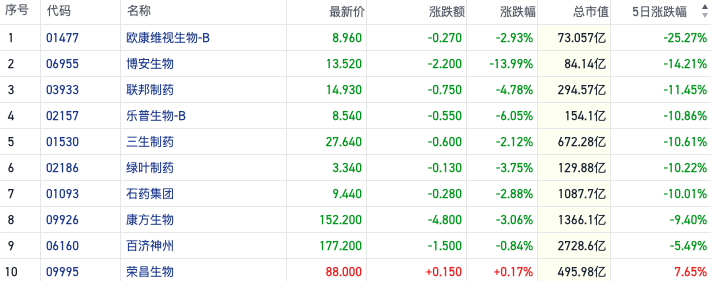 截至8月28日收盘,多只个股5日跌幅均已达两位数以上,此外百济神州(06160.HK)、康方生物(09926.HK)等明星龙头股也都高位滞涨。