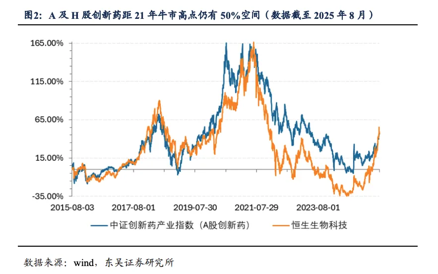 纵向对比,目前恒生生物科技等创新药指数离21年高点仍有约50%空间。