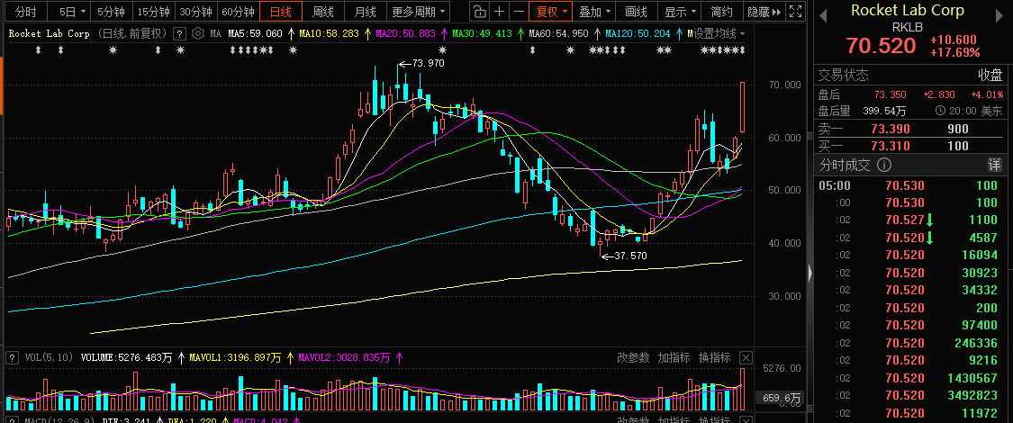 带头领涨的火箭实验室为目前唯一成功实现轨道级发射并上市的“第二梯队”领头羊,刚获得来自美国太空发展局(SDA)的巨额订单,也是其自身历史上最大的订单。