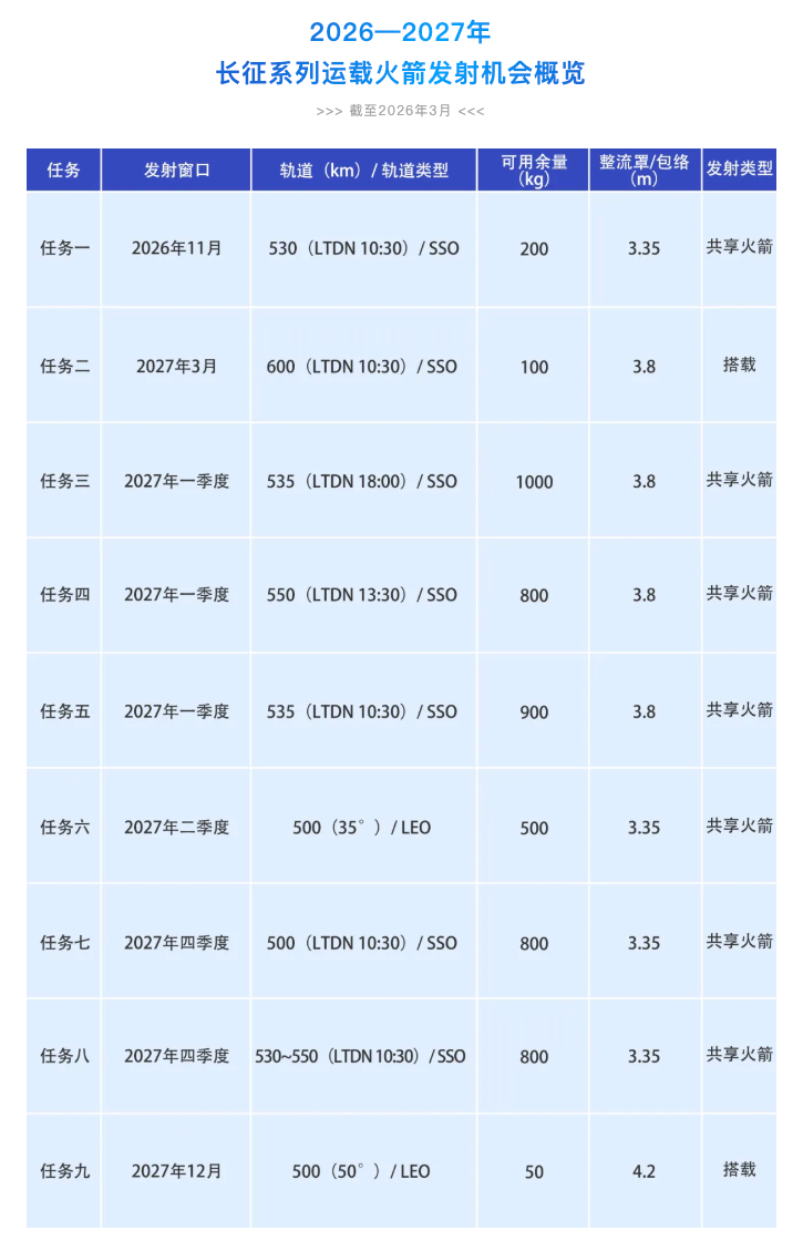 中国商火发布2026-2027年长征系列运载火箭发射机会概览