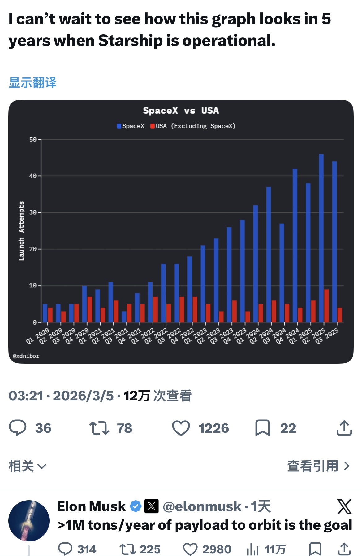 【马斯克称星舰目标是每年将100万吨有效载荷送入轨道】财联社3月6日电,当地时间周三,一位用户在社交平台X上发帖,对比了SpaceX与其他美国公司的发射尝试次数。该用户写道:“我迫不及待地想看看5年后星舰投入运营时,这张图表会变成什么样子。”马斯克回应称:“目标是每年将100万吨有效载荷送入轨道。”